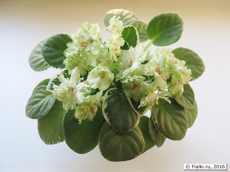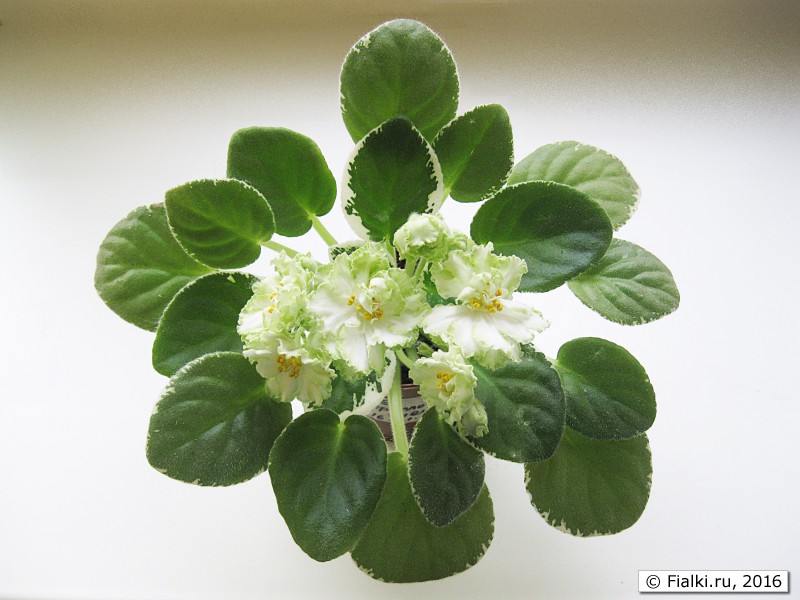 Розетка ровная, формируется легко. Лист округлый средне-зеленый с белым краем. Пестролистность хорошо проявляется даже при высокой температуре.