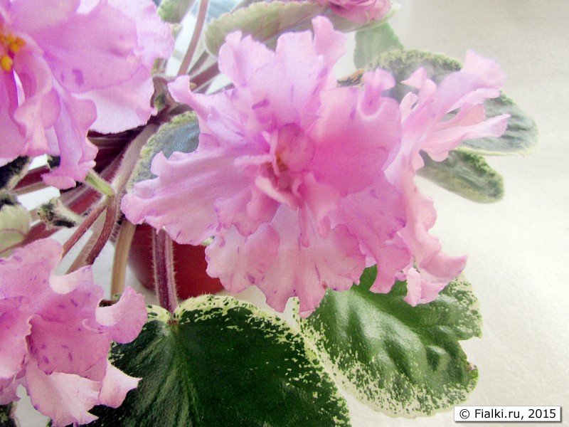 Махровые лавандово-розовые оборчатые цветки с фиолетовым фэнтези, вариабельной фиолетовой каймой. Листва пестролистная средне-зеленая с кремовым, сердцевидная, стеганая, глянцевая. Стандарт.