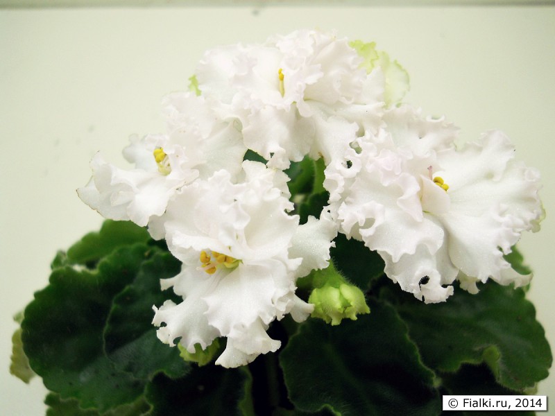 Белоснежные, крупные до 4 см цветы с кружевным гофрированным краем. Цветы полумахровые и махровые расположены на крепких не очень высоких цветоносах по 2-5 на каждом. Зеленая кайма присутствует пока цветок только раскрылся, позже пропадает. Шикарный букет, порой, практически, закрывает розетку. Цветы держатся долго. Цветение частое и обильное. Иногда при высокой температуре в помещении цветы могут приобретать чуть розоватый оттенок.