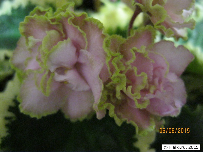 Фиалка Ma`s Corsage (O. Robinson). Махровые розовые цветы с гофрированным светло-зелёным краем. Стёганная зубчатая зелёно-белая волнистая листва. Стандарт.
