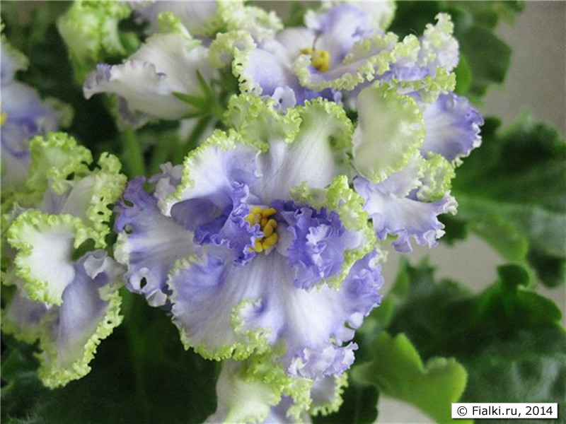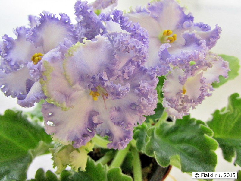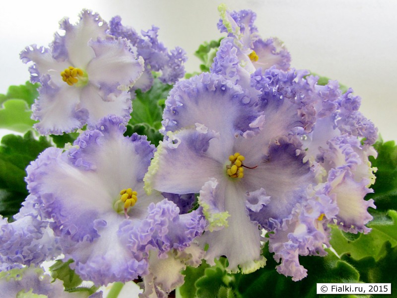 Татьяна Лысикова. Необычайно нежный красивый сорт. Чудесные кружева по краю каждого лепестка, в прохладных условиях зеленый цвет рюши проявляется более ярко. Каждый цветок - индивидуальность, форма и рисунок у каждого разный. Растет быстро, зацветает рано и сразу красивым букетом. Цветение продолжительное и почти не прекращается при достаточном количестве света. Розетка требует хорошего освещения, при его недостатке листья поднимаются вверх. У меня растет на фитиле на стеллаже под светодиодами. Чтобы розеточка распрямилась, пришлось поднять ее ближе к светодиодам. Сорт легок в уходе, хорошо и быстро размножается черенками.