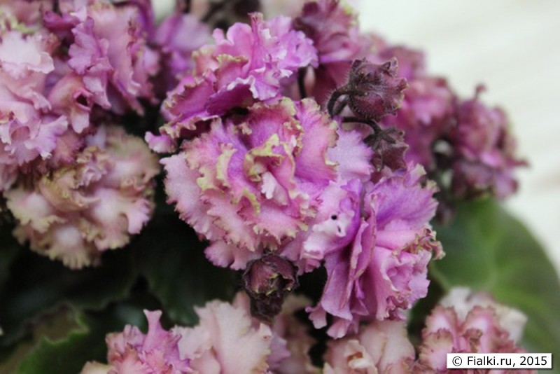 Очень красивый, обильно и часто цветущий сорт с цветами розочками. Бутоны имеют бронзовый цвет. Раскрывшийся цветок - темно-розовый с зелено-бронзовой каймой, но со временем становится значительно светлее. Цветы расположены на крепких цветоносах 5-7 цветrов на каждом (у взрослой розетки). Цветы держатся долго. Если в помещении жарко, то довольно быстро начинают темнеть внутренние лепестки.