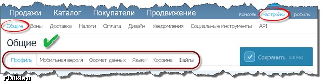 Меню «61 Общие», панель управления Эквид (Ecwid)