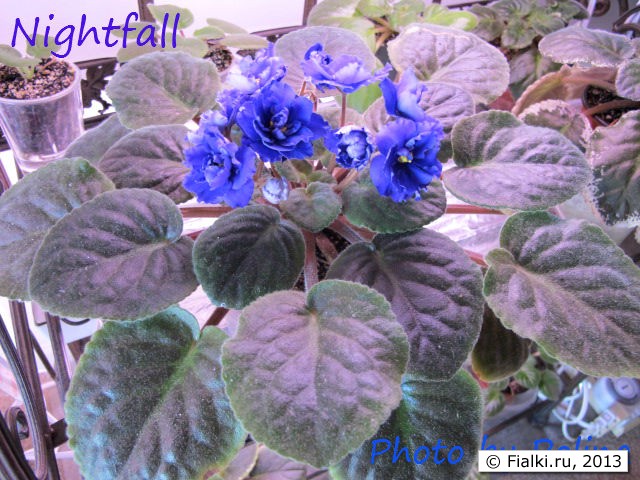 Одна из моих любимиц (к сожалению у меня есть фиалки, которые со временем "уйдут в хорошие руки" - не нравятся розетки, цвет не нравится и т.д.), которая останется в коллекции навсегда - Nightfall (J. Swift). Описание: полумахровые синие звёзды. Средне-зелёная листва. Стандарт.