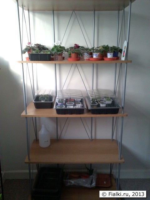 Наконец и я приобрела стеллаж для моих фиалок. По некоторым причинам размер не стандартный: длина полки 80 см ширина 40 см., расстояние между полками около 40 см.