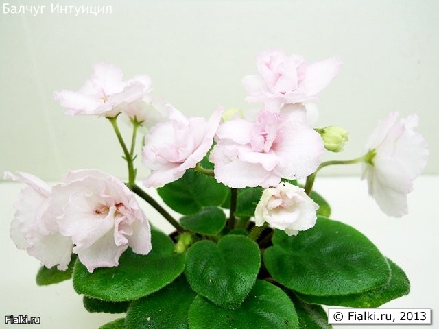 Шапка красивых полумахровых белых фиалковых цветов с синим глазком и тончайшей каемкой, уже при первом цветении этот сорт восхищает обильной пеной цветов. Лист светло-зеленый, сердцевидный, едва стеганый. (Описание автора).