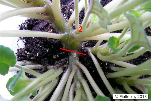 Стараемся удалить все лишние пасынки, которые мешают друг другу. При этом, оставшиеся пасынки должны быть равномерно распределены по окружности нашего горшка. У меня на центральной плети сверху есть маленький пасынок (на фото обозначен номером 2), его я оставлю. В будущем он будет прикрывать оголяющуюся основную плеть и красиво цвести сверху горшка. Думаю, верхушку этого пасынка надо прищипнуть, что бы кустился, а не удлинялся.