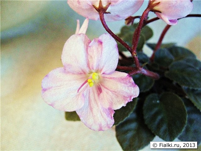 Следующая фиалочка - полуминиатюра Storybook princess (S.Sorano) Нежно-розовые полумахровые цветы с удивительными темно-розовыми фэнтези-штрихами и темно-синими фэнтези-точками; темно-зеленая зубчатая листва.