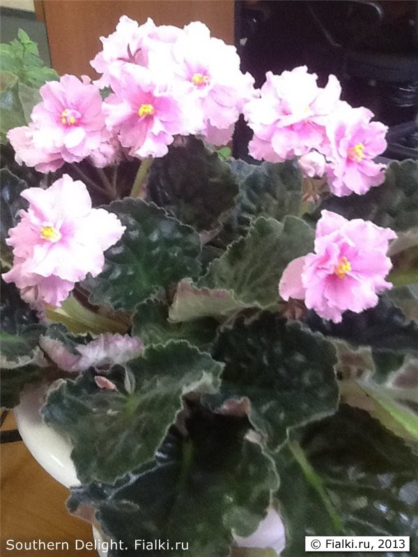 Моя любимица - Southern Deligh от Sorano. Это, можно сказать, "бройлерная" фиалка. Растет как на дрожжах. Я ее посадил в огромный горшок. Листья размером с ладонь. И цветы очень крупные, как заявлено у этого сорта, - до 9 см. То есть величина горшка никак не сказалась на ухудшении цветения. Но это, конечно, если место есть свободное