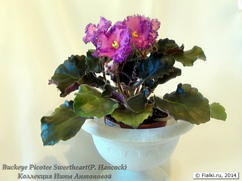 4.Buckeye Picotee Sweetheart (P.Hancock).Великолепные розовые гофрированные полумахровые цветы с более темной каймой напылением.Настоящий нокаут. Темно-зелено-розово-кремовая зубчатая выставочная листва.Очень эффектный сорт.Первое цветение молодой розетки.Только что распустившийся цветок иммет нежно-розовое поле лепестков, с возрастом темнеет: