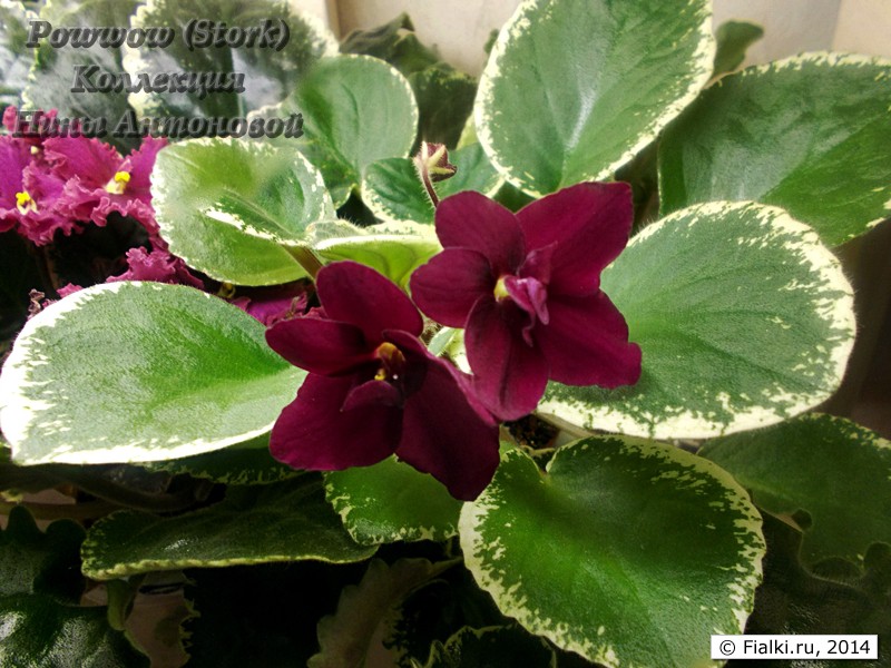 20.Powwow(Stork) . Простые и полумахровые бархатные звезды темно-красного цвета. Светлая розетка с окаймляющей пестролистностью. Очень эффектный сорт! Стартует молодая розетка: