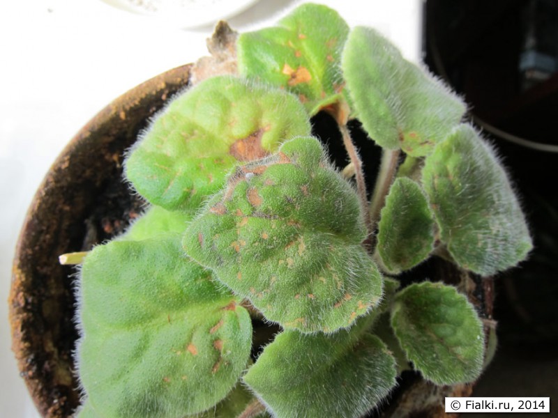 В один день у 6 фиалок коричневые пятна и ожоги на листьях
