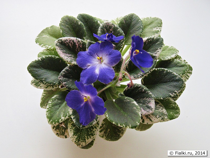 Heinz's Little Nugget - удивительный сорт! Необыкновенно красивая устойчивая пестролистность, даже без цветов розетка выглядит всегда нарядной. Цвет напечатков на лепестках - пронзительно синий и в сочетании с белой звездой в центре получается очень яркий букетик. Возможно, твоей розетке жарковато... поэтому цветочки немного заплыли... И еще мне нравится, что цветоносы у этого сорта белого цвета. И с цветами, и без цветов розетка - пеструшка.