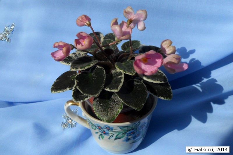 Н-Розовый Туман я растила с листа, сортик оказался очень плодовитым. Выставочная розетка приближалась размерами к малому стандарту, тем более приятно было, когда в моих условиях зацвела скромных размеров полумини с очень необычными розово-палевыми колокольчиками: