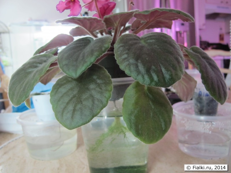 Здесь всё видно без комментариев - лист обрезан больше, чем наполовину из-за того, что подгнивал, но деток это не касается - растут (4-см стаканчик)! (Извините за нечёткое фото.)