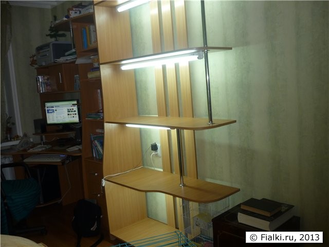 В народной практике фиалочницы крепят люминесцентные лампы к низу вышестоящей полки, сделанной из древесностружечных плит, шпонированных под дерево: