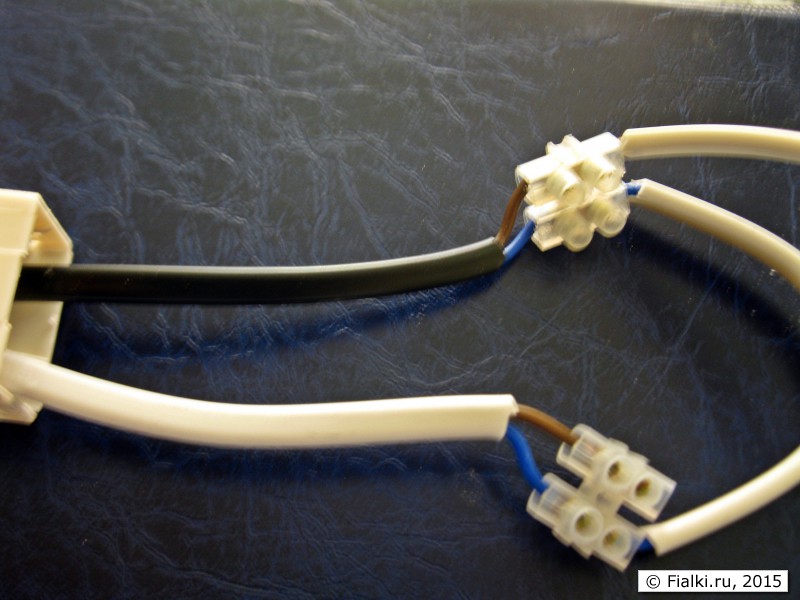 Слева подходят два провода (на моей фотографии), справа один. Я их обрезала и соединила с помощью клеммников вот таким образом: