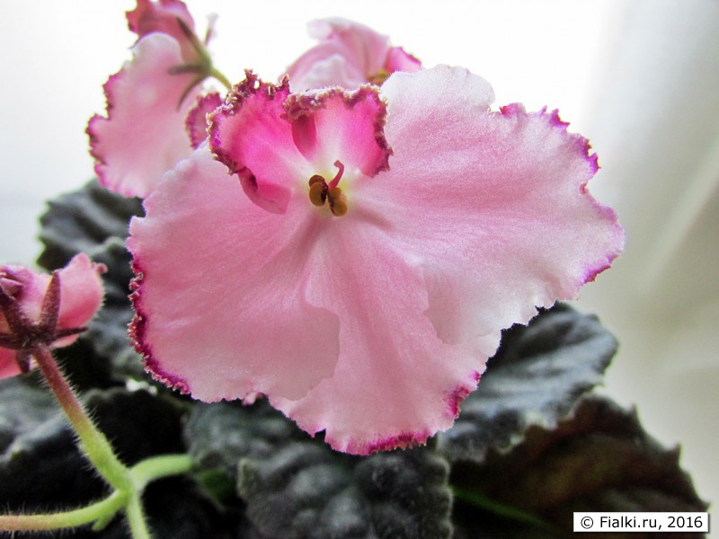 Очень быстрый сорт (черенок был куплен в первых числах января этого года, а во второй половине июля уже зацвел), розетка для таких крупных цветов (у меня были до 7 см, а на выставке видела розетку, где цветы были до 10 см, с нее и покупала черенок