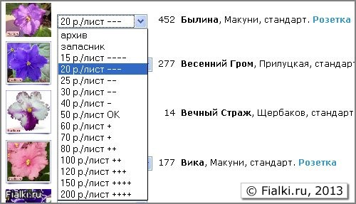 Администрация Каталогов Fialki.ru не вмешивается в ценообразование. А лишь помогает покупательницам и продавцам договориться относительно справедливой цены на каждый сорт.
