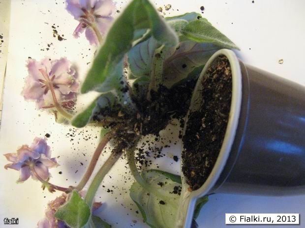 Вид у фиалок не здоровый. Листья вялые - явно проблемы с корнями. Сначала возьмем левую фиалку. Смотрим корни: