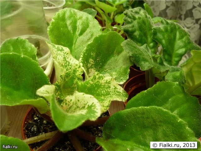 Такое явление не на всех розетках. Причем сорта на фото - не пестролистные. А пестролистник( к сожалению сорта не знаю) повел себя совершенно неожидано. Дело в том, что розетка с которой брала листик была практически зеленой, лишь немного совсем мелких светлых пятнышек можно было заметить по краям листьев. Детки росли сначала беленькие. Потом взрослые листья стали зеленеть и детка стала развиваться с почти зеленными листьями. Но после того, как я ее поставила на стеллаж - поперли очень пестрые листья: