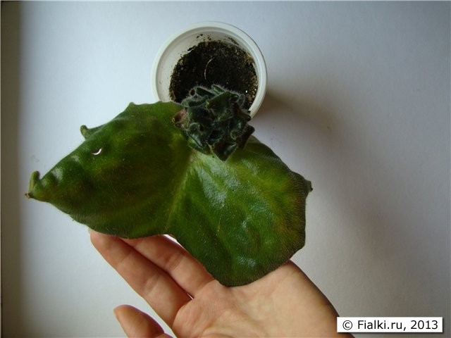 Доброе всем время суток! Листовой черенок сорта ЛЕ- Зимняя Сказка был посажен 02.11.2010г. Детки долго не появлялись и я обрезала верхнюю часть листочка. Вскоре появились детки, но не внизу черешка, а в верхней его части, на самом листочке: