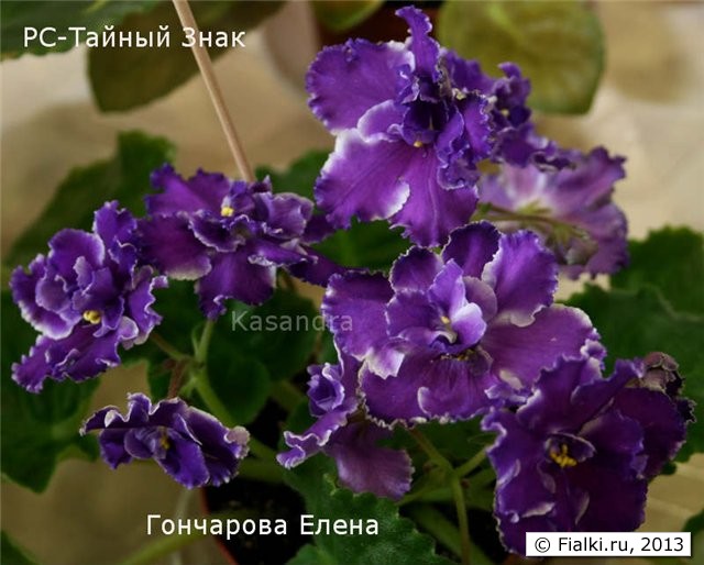 РС Тайный Знак. Сорт 2009 года. Шикарный букет полумахровых, гофрированных сине-фиолетовых цветов с белыми краями и белым глазком прекрасно гармонирует со средне-зелёной заострённой листвой (Описание автора). От себя скажу, сорт мне понравился, первое цветение и шапочка цветов, мало белого, но это поправимо, надо поставить в прохладное место.