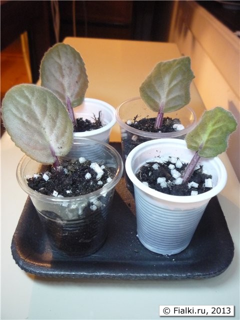 Вот уже три недели, как решаюсь, написать или подождать... Мой выбор в итоге остановился на последнем. Так и своим первым опытом могу поделиться, и может кто-нибудь советом поможет. Черенки я взяла с двух умирающих фиалок.Они стояли у знакомой на кухне на холодильнике в стакане с водой. Смотрела я на это черное дело несколько месяцев, а потом выпросила их себе. У фиалки были листики перегнутые, посадить даже не смогла бы. Корни коричневые и безобразные. Решила попробовать укоренить черенки. Это мой первый опыт. На тот момент листиков у меня было много. Но зима, не подходящие условия и выжили только два. И это тоже был долгий процесс с ошибками и огрехами. Сначала они стояли в воде. Но ничего хорошего из этого не получалось. Решила укоренять в земле. В нашем Ужгороде к сожалению ни вермикулита, ни перлита. Один керамзит, и то очень крупный. Побегала две недели безрезультатно, и купила только грунт для фиалок. В него добавила песочка и нарезала пенопласт. Устроила над черенками лампу дневного света. Стоят они у меня на подоконнике, в тепличке. Черенки пускали корни полтора месяца. А вот детки полезли одновременно, первых деток я заметила 1-го марта.