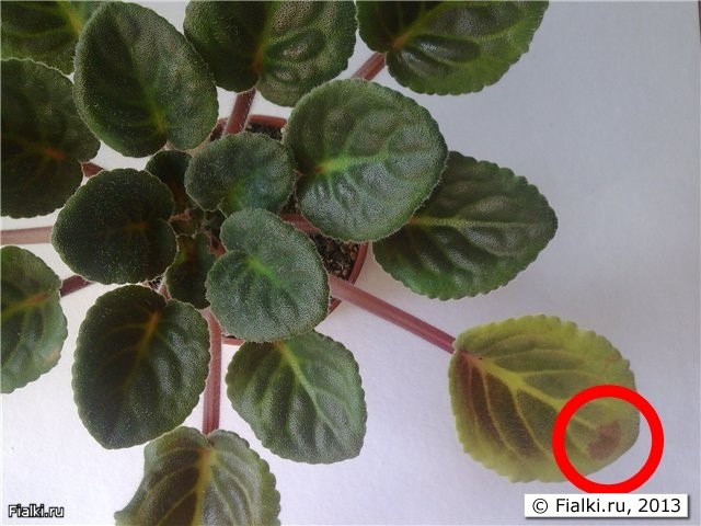 Здравствуйте! Иногда наши фиалки болеют. И не всегда мы знаем, как помочь нашим любимицам. Тогда мы обращаемся на форум за помощью с фотографией заболевшей. Сегодня я расскажу, как пометить на фото с помощью редактора Photoscape те места на фиалке, которые нас волнуют. Итак, вот что мы получим в итоге: