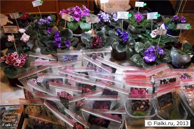 Поскольку за зиму наросло огромное количество деток, большую часть экспозиции занимали они и укоренённые черенки в зип-пакетах, которые очень многим пришлись по вкусу: недорого и уже с корнями. Фотографии на пакеты с черенками печатаю на обычной бумаге и клею скотчем. В таком деле большую помощь оказывает честность: если фиалка у меня ещё не цвела и фото взято из интернета, я обязательно предупреждаю покупателя о возможных сюрпризах, это касается и сортов, склонных к спортированию. Большинство же фотографий сделаны с моих собственных растений или сняты на выставках, фото тех розеток, с которых я покупала черенки. Деток я упаковала ещё дома в целлофан, а после, завернула в кусочки синтепона и в фасовочные пакеты, так что они даже не почувствовали перепадов температуры.