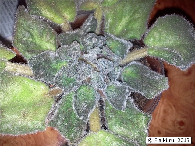 Если это назвать "небольшим загущением" то что по Вашему - большое загущение? Здесь не только ужасно загущенный центр, но и мелкие листья, серый налет. Да и в любом случае принесенную со стороны фиалку первым делом надо обрабатывать, если конечно она не приобретена у проверенных опытных продавцов!