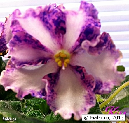Victorian Flirt (S. Sorano) (7998) 10/08/1993 Semidouble chimera pink frilled star/white stripe, blue fantasy. Medium green, plain, quilted. Полумахровые волнистые розовые звезды с белыми полосками, с синим фэнтези. Средне-зеленая простая стеганая листва.