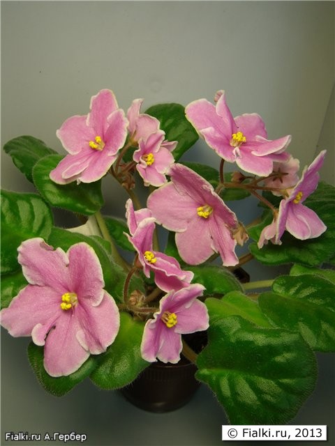 Pink Amiss (Eyerdom).Полумахровые пронзительно-розовые цветы с белым краем. Простая светло-зеленая листва. Стандарт.Это моя "старушечка".С которой я никогда не расстанусь.Фиалка просто неимоверная цветунья!Самая первая,после отдыха, набирает бутоны.Держаться они очень долго.На одном цветоносе их от 5-ти и более.