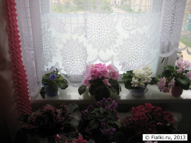 Я тоже,ещё по весне,повесила такую шторку из одноразовой простыни в два слоя на моё юго-восточное окно.Но пёстриков оттуда пришлось всё равно убрать.А фиалки ваши великолепные!