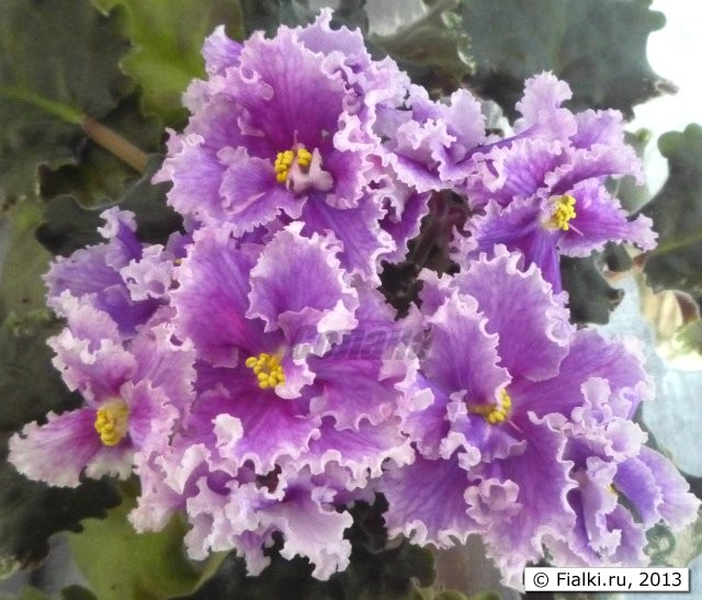Описание от селекционера: Очень оригинальные, крупные простые и полумахровые фиолетовые цветы, с ярко-розовыми «горошинами» фэнтези, с широкой светло-сиреневой каймой и гофрированными краями. Нарядная, красивая, гофрированная, тёмно-зелёная с белым и розовым листва. (2009г.)